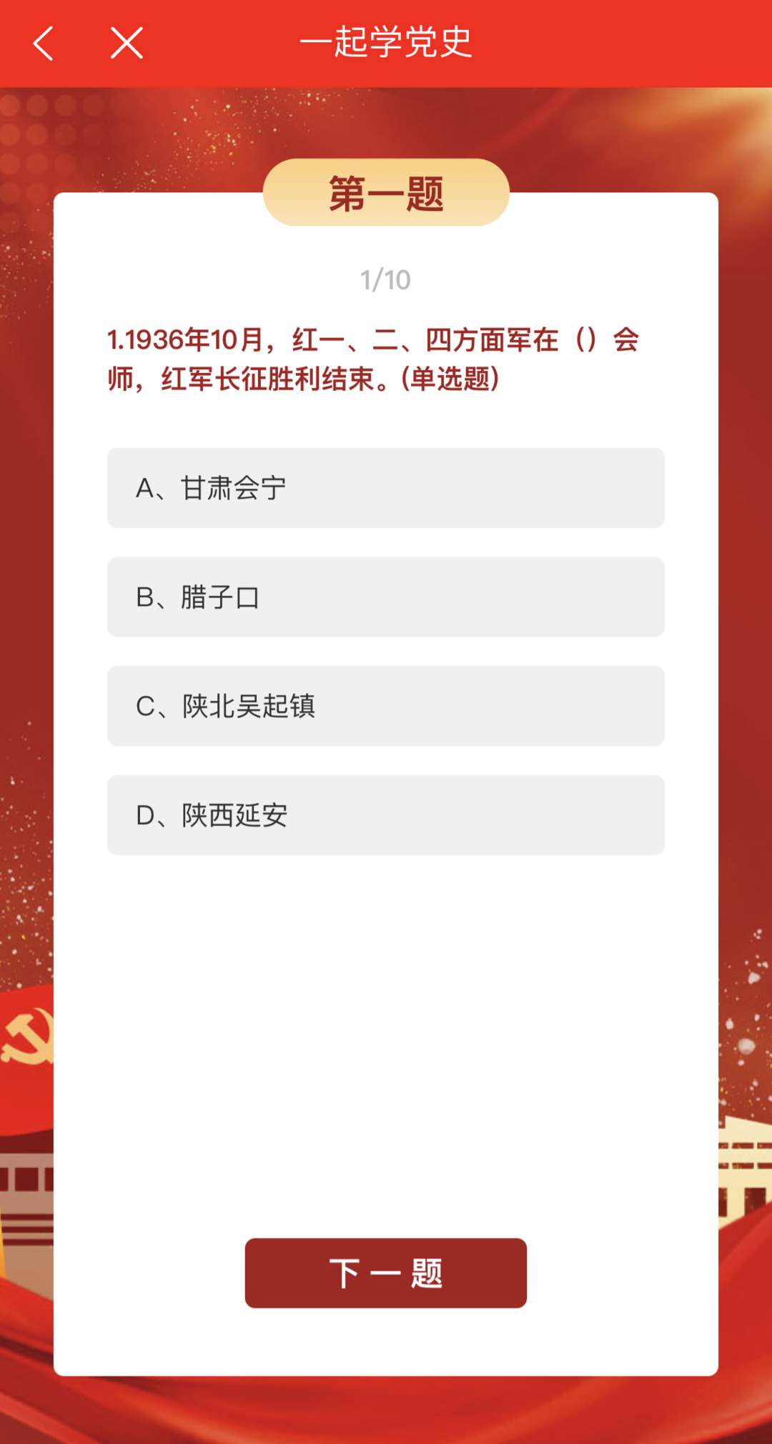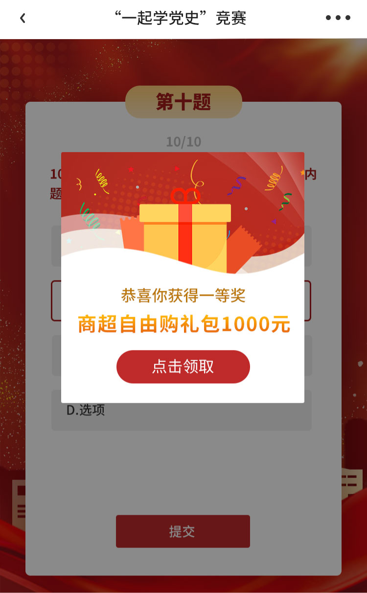 职工通过下载APP,在首页找到“一起学党史”,进入竞赛页面。每次10道题,答对6道及以上即可参与抽奖,活动期间每位职工答题次数不限。