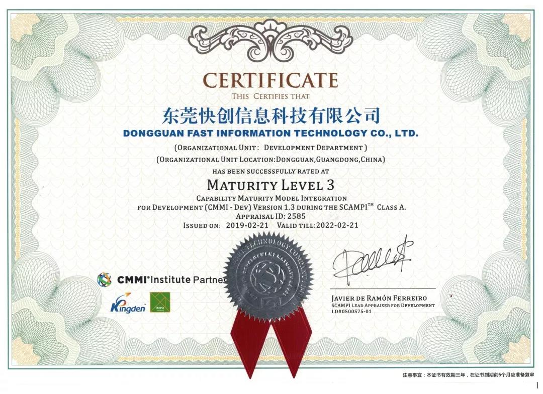 最终经过综合评定,快创科技高度符合CMMI3的全部要求,顺利通过CMMI3认证,东莞仅有少数几家企业获此殊荣!