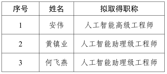 经东莞市工程系列人工智能专业副高级职称评审委员会评审,下列同志拟取得职称,现予公示。公示时间为2025年8月_7_日至2025年8月_13_日(共5个工作日)。若对下列同志取得职称有异议,请在公示期间书面向东莞市科学技术局或本单位纪检监察(人事)部门反映。反映情况和问题必须实事求是、客观公正。反映情况的书面材料应署本人真实姓名(姓名需手写,不能电脑打印)和联系电话,否则视为无效投诉,将不予受理。