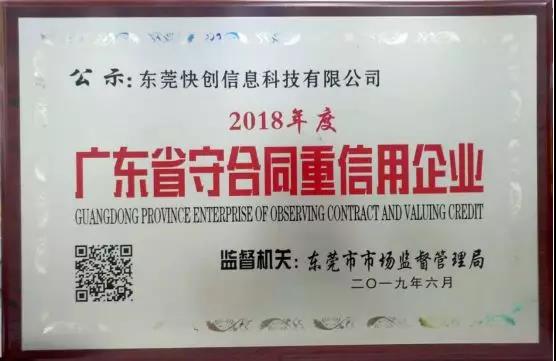 2019年6月1日,东莞快创信息科技有限公司成功获评2018年度广东省“守合同,重信用”企业,预示着快创科技在走向市场经济规范化,提高企业守法经营能力,塑造企业良好信誉形象又迈上了一个新台阶。