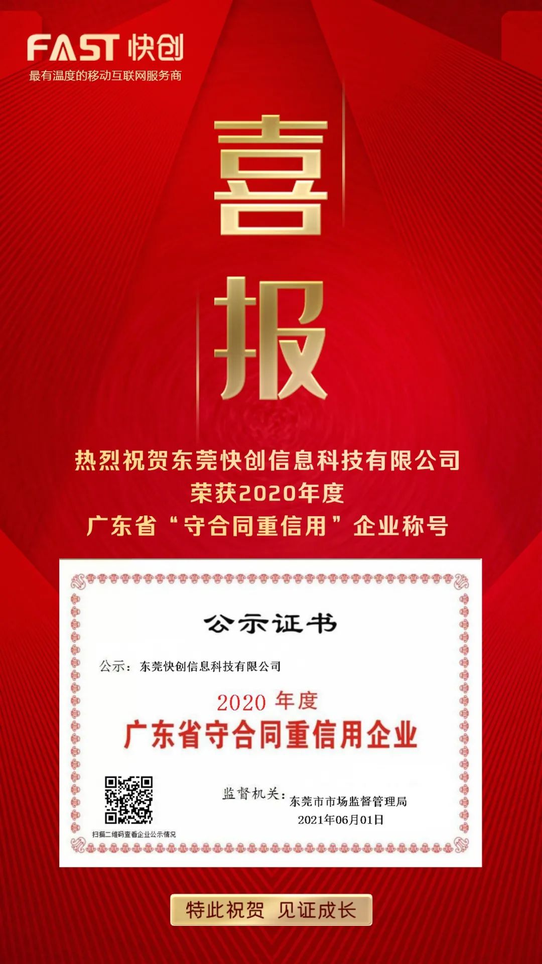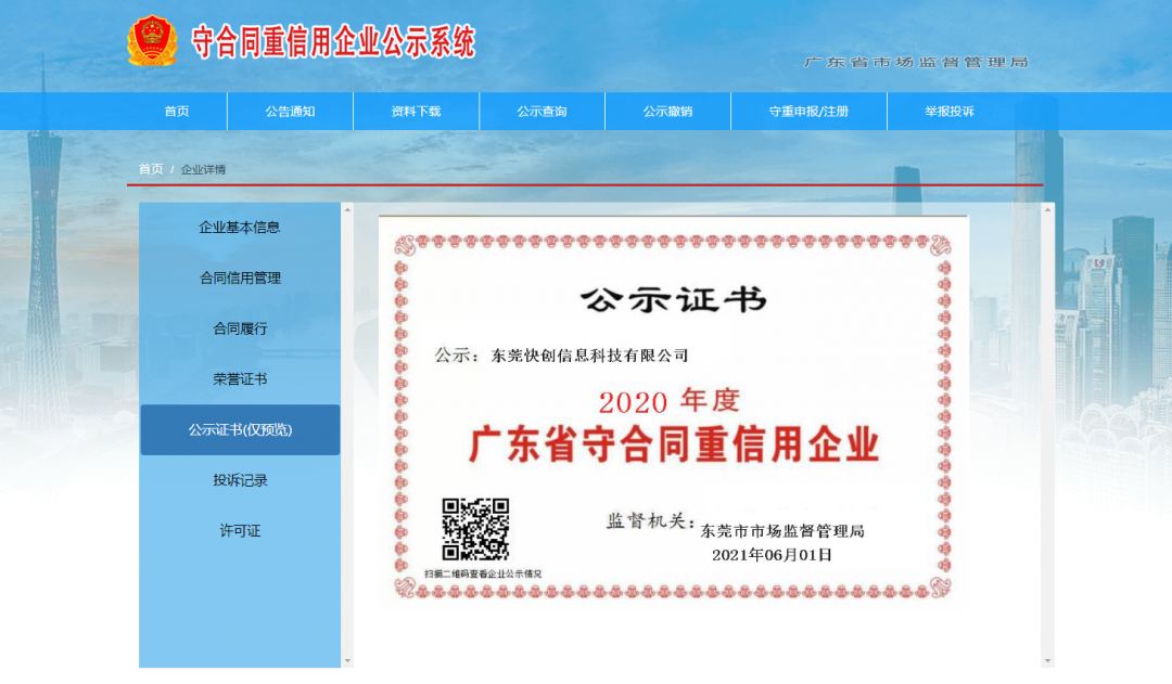近日,经东莞市市场监督管理局审核批准,东莞快创信息科技有限公司荣获2020年度广东省“守合同 重信用”企业称号。这是快创科技第3年及连续3年入选广东省“守合同重信用”企业名列!